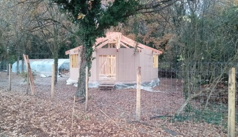 Le nouveau site de la pépinière prend forme… C’est incroyable ! Les mares la semaine dernière, Et puis, depuis mardi, nous construisons la maison dans laquelle je vivrai au plus près de mes bébés arbres avec mes enfants humains et mon compagnon.